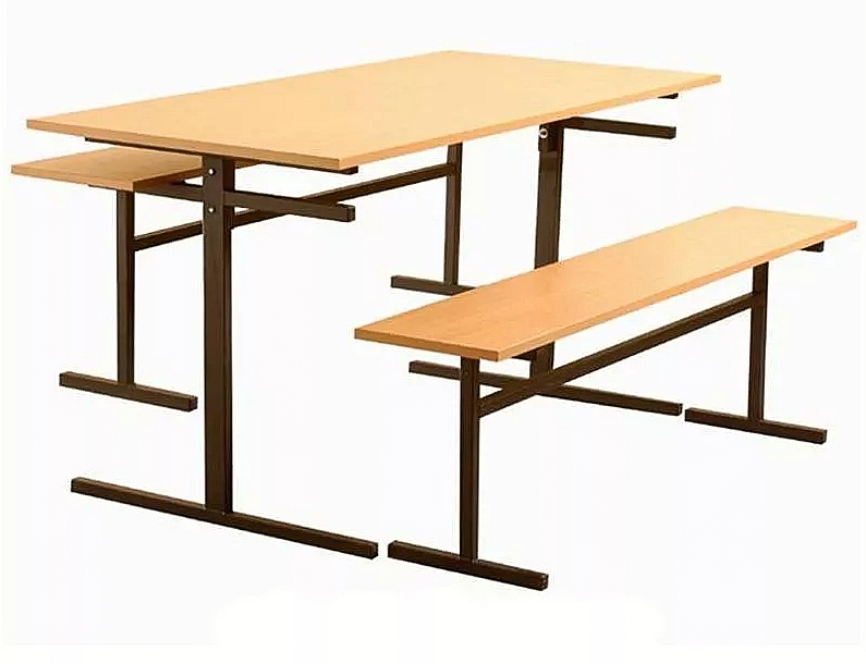 Классический комплект мебели может использоваться для оснащения столовой в школе, общежитии, ином муниципальном учреждении. В целях экономии пространства под столешницей предусмотрены специальные подвески, на которые устанавливаются скамьи. Благодаря этому уборка помещения становится намного удобнее.