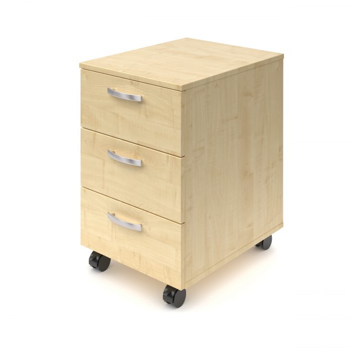Тумба выполнена из ЛДСП 16мм. Торцы топа и фасадов тумбы закрыты противоударной кромкой ПВХ 2мм. Выдвижные ящики устанавливаются на роликовые направляющие. Ящики оснащены металлическими ручками. Тумба устанавливается на пластиковые колесные опоры.