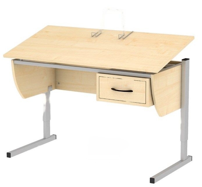 Тумба по желанию может быть закреплена слева или справа. Столешница регулируется по высоте и углу наклона в 13 положениях под углом от 0 до 55 градусов.