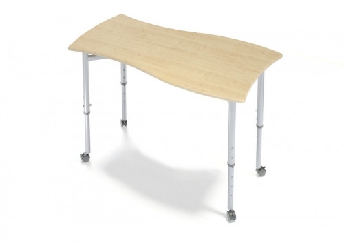 Растущая парта на колесах используется в сочетании с похожими моделями, с другой мебелью или отдельно. Рабочая поверхность в форме плавника закрепляется на каркасе с защитным покрытием.