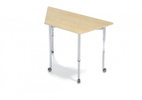 Парта на телескопических опорах меняет высоту. С помощью колес легко передвигается. 6 таких столов можно соединить в шестиугольник с нишей по центру.
