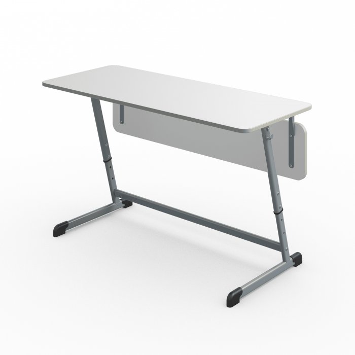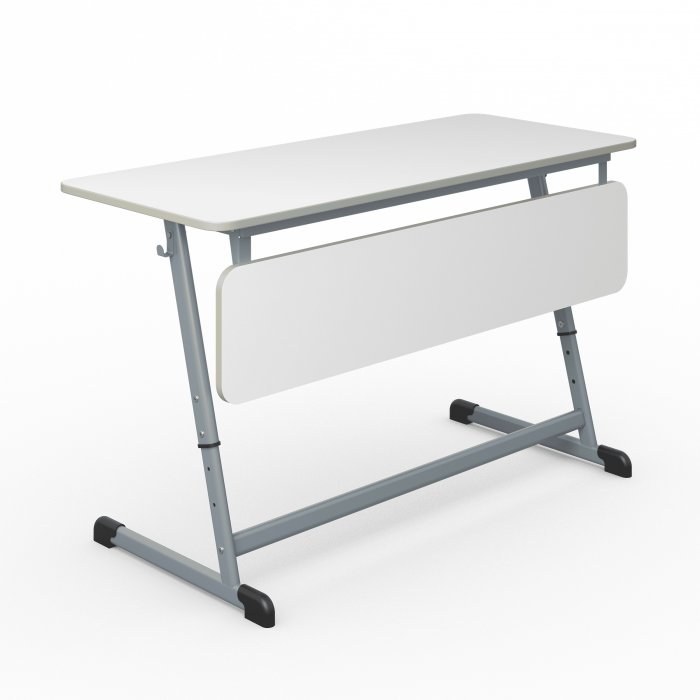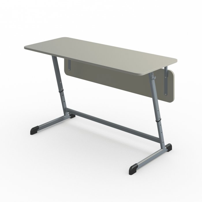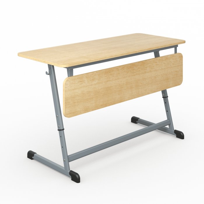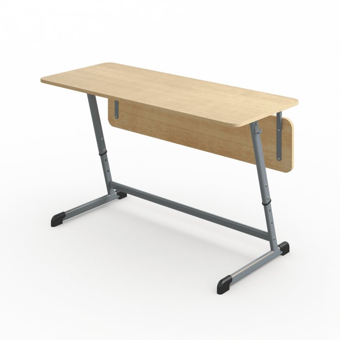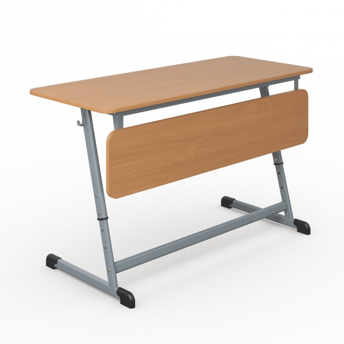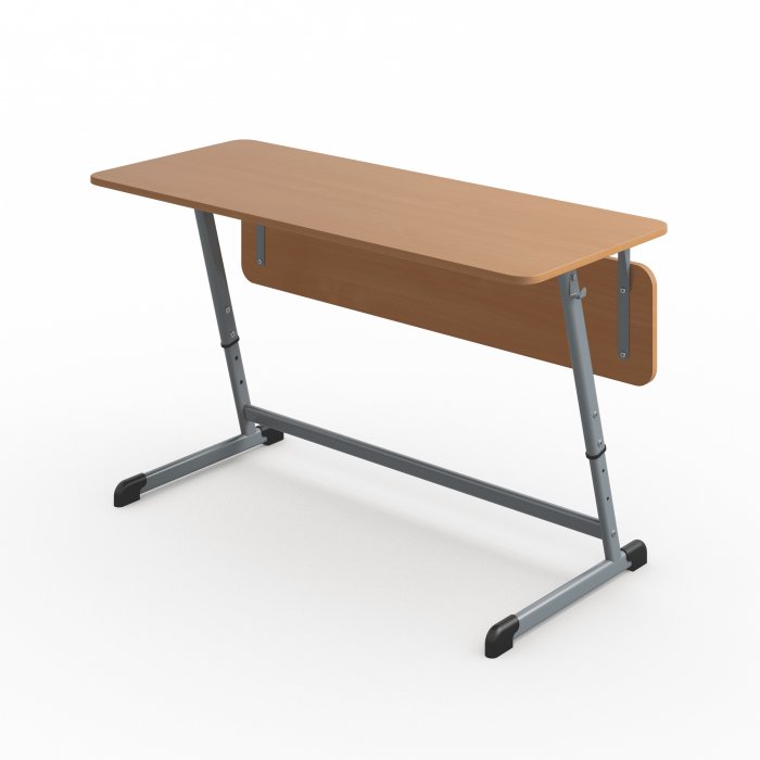 Столешница и фронтальная панель стола имеют закругленные углы и выполнены из ЛДСП толщиной 16 мм. Торцы панелей закрыты противоударной кромкой ПВХ толщиной 2 мм. Опоры стола наклонены к сидящему на 15 градусов и выполнены из плоскоовального металлического профиля 45×25 мм и 40×20 мм с толщиной стенок не менее 1,5 мм. Опоры имеют телескопический механизм регулировки высоты с пластиковой переходной втулкой. Регулировка осуществляется в диапазоне с 3 по 7 ростовые группы. Столешница крепится к опорам через металлическую П-образную раму, выполненную из трубы 25х25мм. Передний экран крепится к раме на металлические кронштейны, толщиной не менее 2мм. Крепление панелей скрытое. Для придания дополнительной жёсткости между опорами в нижней части стола установлена металлическая траверса из плоскоовального профиля 40×20 мм. На свободных концах труб установлены заглушки из ударопрочных полимеров. Каркас стола имеет полимерные подпятники, предотвращающие повреждение напольного покрытия. В конструкции предусмотрено 2 крючка для портфелей. Стол имеет цветовую маркировку в соответствии с ростовой группой и изготавливается в соответствии с ГОСТ 11015-93.