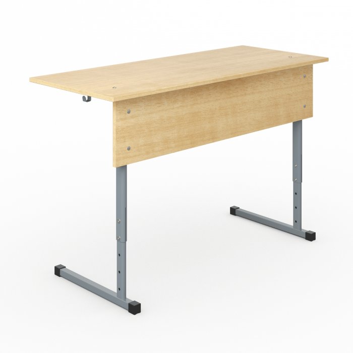 Столешница и фронтальная панель стола выполнены из ЛДСП толщиной 16 мм. Торцы столешницы закрыты противоударной кромкой ПВХ толщиной 2 мм. Торцы фронтальной панели закрыты противоударной кромкой ПВХ толщиной 0,5 мм. Металлический каркас выполнен из профиля квадратного сечения 25×25 мм и плоскоовального профиля 45×25 мм и 20×40 мм с толщиной стенок не менее 1,5 мм. Каркас покрыт порошковой краской, стойкой к химическим и механическим воздействиям. На свободных концах труб установлены заглушки из ударопрочных полимеров. Каркас стола имеет полимерные подпятники, предотвращающие повреждение напольного покрытия. Вся крепёжная фурнитура на металлокаркасе скрыта внутри трубы для продления срока службы изделия. Переднее крепление на столешнице скрытое (резьбовые втулки и болты М6). Заднее крепление на столешнице сквозное (мебельный болт с гайкой). Фронтальная панель крепится к каркасу на мебельные болты с гайками. Диапазон регулировки высоты для ростовой группы 3-7. Механизм регулировки высоты телескопический.Механизм регулировки высоты болтовой. В конструкции предусмотрено два крючка для портфелей. Стол имеет цветовую маркировку в соответствии с ростовой группой. Стол изготавливается в соответствии с ГОСТ 11015-93.