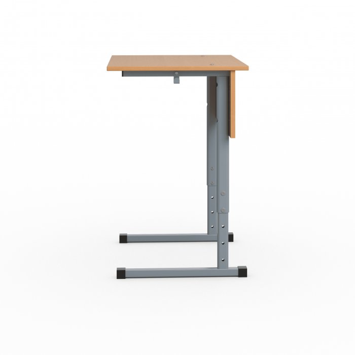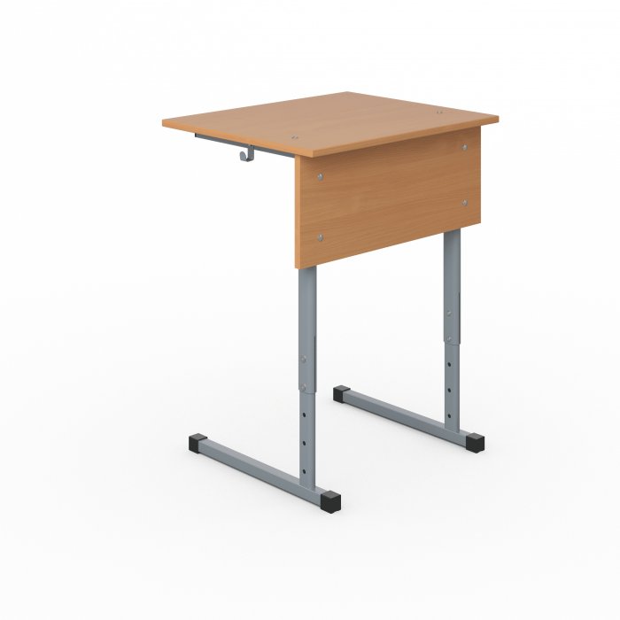 Столешница и фронтальная панель стола выполнены из ЛДСП толщиной 16 мм. Торцы столешницы закрыты противоударной кромкой ПВХ толщиной 2 мм. Торцы фронтальной панели закрыты противоударной кромкой ПВХ толщиной 0,5 мм. Металлический каркас выполнен из профиля квадратного сечения 25×25 мм и плоскоовального профиля 45×25 мм и 20×40 мм с толщиной стенок не менее 1,5 мм. Каркас покрыт порошковой краской, стойкой к химическим и механическим воздействиям. На свободных концах труб установлены заглушки из ударопрочных полимеров. Каркас стола имеет полимерные подпятники, предотвращающие повреждение напольного покрытия. Вся крепёжная фурнитура на металлокаркасе скрыта внутри трубы для продления срока службы изделия. Переднее крепление на столешнице скрытое (резьбовые втулки и болты М6). Заднее крепление на столешнице сквозное (мебельный болт с гайкой). Фронтальная панель крепится к каркасу на мебельные болты с гайками. Диапазон регулировки высоты для ростовой группы 3-7. Механизм регулировки высоты телескопический.Механизм регулировки высоты болтовой. В конструкции предусмотрено два крючка для портфелей. Стол имеет цветовую маркировку в соответствии с ростовой группой. Стол изготавливается в соответствии с ГОСТ 11015-93.