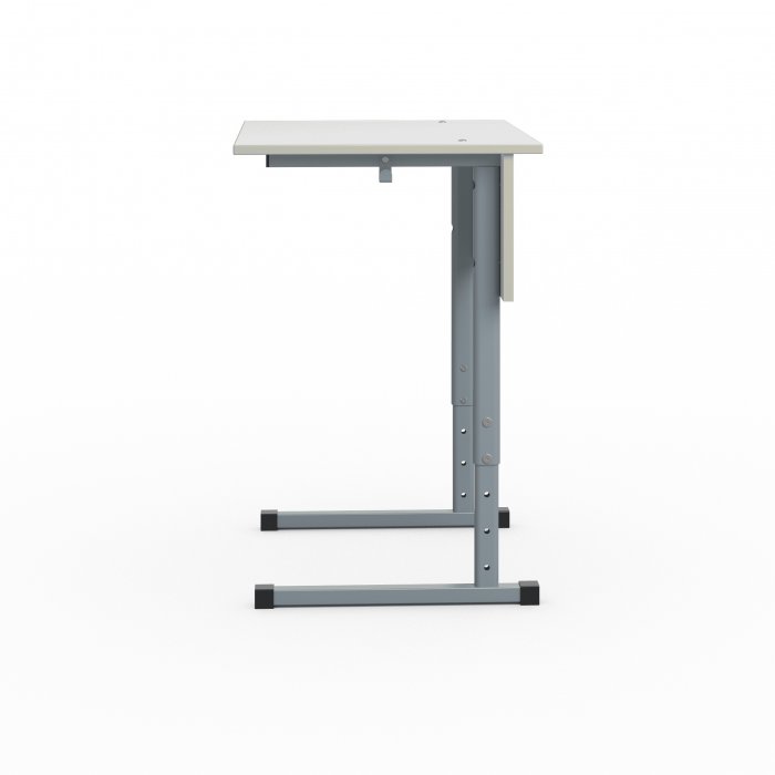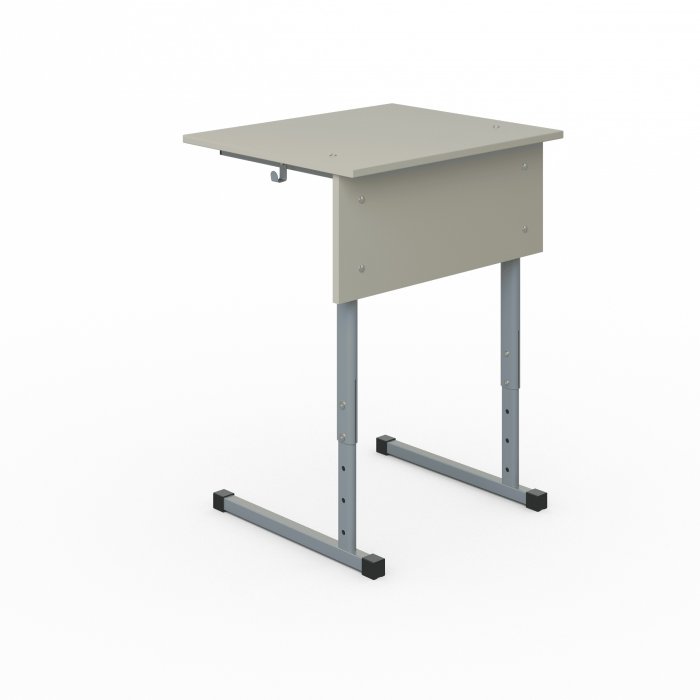 Столешница и фронтальная панель стола выполнены из ЛДСП толщиной 16 мм. Торцы столешницы закрыты противоударной кромкой ПВХ толщиной 2 мм. Торцы фронтальной панели закрыты противоударной кромкой ПВХ толщиной 0,5 мм. Металлический каркас выполнен из профиля квадратного сечения 25×25 мм и плоскоовального профиля 45×25 мм и 20×40 мм с толщиной стенок не менее 1,5 мм. Каркас покрыт порошковой краской, стойкой к химическим и механическим воздействиям. На свободных концах труб установлены заглушки из ударопрочных полимеров. Каркас стола имеет полимерные подпятники, предотвращающие повреждение напольного покрытия. Вся крепёжная фурнитура на металлокаркасе скрыта внутри трубы для продления срока службы изделия. Переднее крепление на столешнице скрытое (резьбовые втулки и болты М6). Заднее крепление на столешнице сквозное (мебельный болт с гайкой). Фронтальная панель крепится к каркасу на мебельные болты с гайками. Диапазон регулировки высоты для ростовой группы 3-7. Механизм регулировки высоты телескопический.Механизм регулировки высоты болтовой. В конструкции предусмотрено два крючка для портфелей. Стол имеет цветовую маркировку в соответствии с ростовой группой. Стол изготавливается в соответствии с ГОСТ 11015-93.