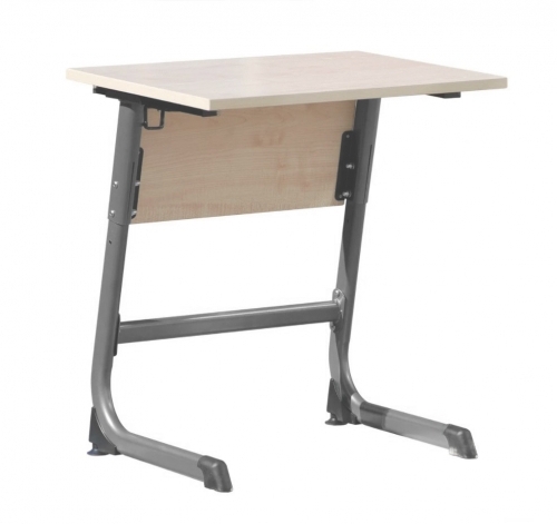 Одноместный стол с изменяемой высотой соответствует СанПиН. Каркас выполнен из плоскоовальной трубы. 2 ножки переходят в полозья с травмобезопасными наконечниками. Неровности пола компенсируются подпятниками. Опоры дополнены перекладиной.