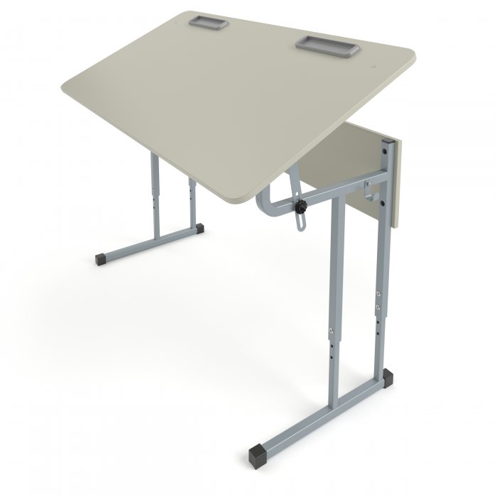 Столешница и фронтальная панель стола выполнены из ЛДСП 16мм. Торцы столешницы закрыты противоударной кромкой ПВХ толщиной 2мм. Торцы фронтальной панели закрыты противоударной кромкой ПВХ толщиной 0,5мм. Металлический каркас выполнен из профиля квадратного сечения 25х25 мм и 20х20мм с толщиной стенок не менее 1,2 мм и покрыт порошковой краской, стойкой к химическим и механическим воздействиям. На свободных концах труб установлены заглушки из ударопрочных полимеров. Каркас стола имеет полимерные подпятники, предотвращающие повреждение напольного покрытия. Вся крепежная фурнитура на металлокаркасах скрыта внутри трубы для продления срока службы изделия. Переднее крепление на столешнице скрытое (резьбовые втулки и болты М6). Заднее крепление на столешнице сквозное (мебельный болт с гайкой). Фронтальная панель крепится к каркасу на мебельные болты с гайками. Регулировка высоты осуществляется с помощью винтовых соединений с гайкой Эриксона. Ступенчатая регулировка угла наклона от 0 до 75 градусов производится с помощью двух опор с зажимными винтами. В конструкции предусмотрено 2 крючка для портфелей. Стол имеет цветовую маркировку в соответствии с ростовой группой.