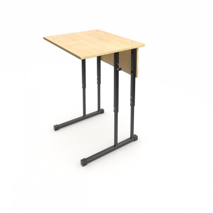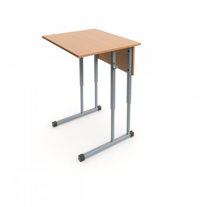 Столешница и фронтальная панель стола выполнены из ЛДСП 16мм. Торцы столешницы закрыты противоударной кромкой ПВХ толщиной 2мм. Торцы фронтальной панели закрыты противоударной кромкой ПВХ толщиной 0,5мм. Металлический каркас выполнен из профиля квадратного сечения 25х25 мм и 20х20мм с толщиной стенок не менее 1,2 мм и покрыт порошковой краской, стойкой к химическим и механическим воздействиям. На свободных концах труб установлены заглушки из ударопрочных полимеров. Каркас стола имеет полимерные подпятники, предотвращающие повреждение напольного покрытия. Вся крепежная фурнитура на металлокаркасах скрыта внутри трубы для продления срока службы изделия. Переднее крепление на столешнице скрытое (резьбовые втулки и болты М6). Заднее крепление на столешнице сквозное (мебельный болт с гайкой). Фронтальная панель крепится к каркасу на мебельные болты с гайками. Регулировка высоты осуществляется с помощью винтовых соединений с гайкой Эриксона. В конструкции предусмотрено 2 крючка для портфелей. Стол имеет цветовую маркировку в соответствии с ростовой группой.