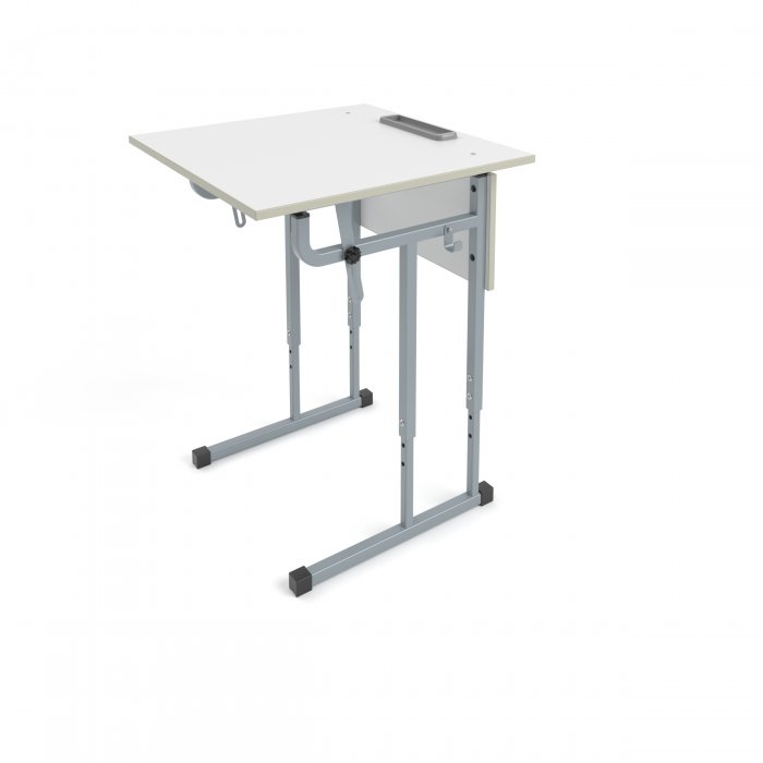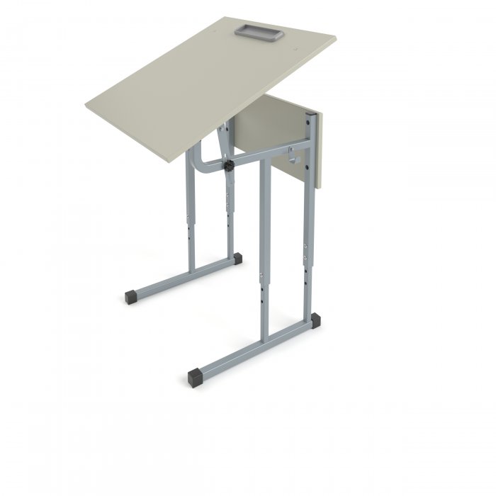 Столешница и фронтальная панель стола выполнены из ЛДСП 16мм. Торцы столешницы закрыты противоударной кромкой ПВХ толщиной 2мм. Торцы фронтальной панели закрыты противоударной кромкой ПВХ толщиной 0,5мм. Металлический каркас выполнен из профиля квадратного сечения 25х25 мм и 20х20мм с толщиной стенок не менее 1,2 мм и покрыт порошковой краской, стойкой к химическим и механическим воздействиям. На свободных концах труб установлены заглушки из ударопрочных полимеров. Каркас стола имеет полимерные подпятники, предотвращающие повреждение напольного покрытия. Вся крепежная фурнитура на металлокаркасах скрыта внутри трубы для продления срока службы изделия. Переднее крепление на столешнице скрытое (резьбовые втулки и болты М6). Заднее крепление на столешнице сквозное (мебельный болт с гайкой). Фронтальная панель крепится к каркасу на мебельные болты с гайками. Регулировка высоты осуществляется с помощью винтовых соединений с гайкой Эриксона. Ступенчатая регулировка угла наклона от 0 до 75 градусов производится с помощью двух опор с зажимными винтами. В конструкции предусмотрено 2 крючка для портфелей. Стол имеет цветовую маркировку в соответствии с ростовой группой.