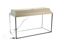 Прямоугольный аквариум с рельефной крышкой оснащен специальным отверстием для кормления рыб, встроенной лампой и переключателем на шнуре.