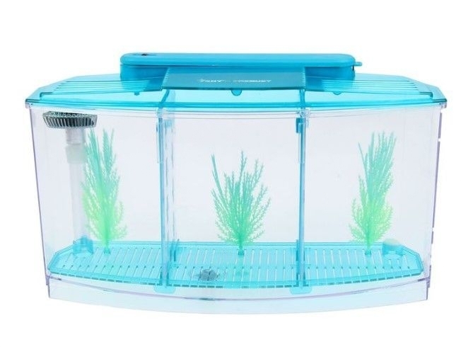 Аквариум с подсветкой укоплектован фильтром и готов к использованию. Может размещаться в живом уголке ДОУ или школы. 3-секционный отсадник украшен искусственными растениями, которые мерцают разными цветами при включенной лампе. В яркой крышке наличествуют откидные люки для подачи корма. Благодаря прозрачным стенкам содержимое аквариума просматривается со всех сторон.