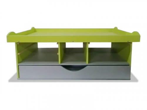 Стол предназначен для работы с конструкторами. Высокие бортики с закругленными углами предотвращают падение мелких деталей. Под столешницей расположены открытые полки для хранения, в нижней части конструкции - ящик с дверцей.