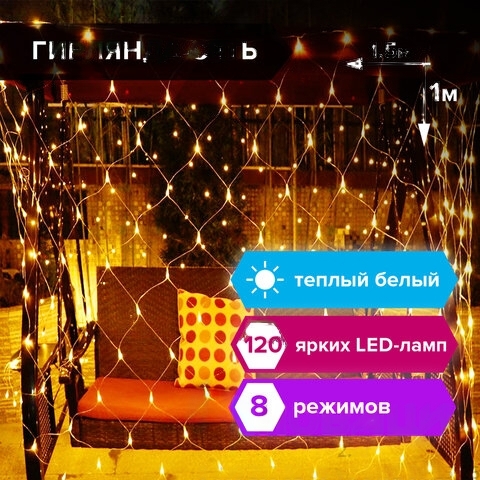 Электрогирлянда светодиодная ЗОЛОТАЯ СКАЗКА "Сеть", 120 ламп, 1,5х1 м, теплый белый, контроллер, 591104
