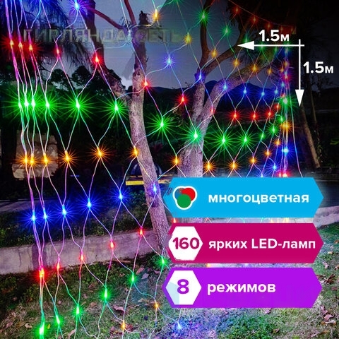 Электрогирлянда светодиодная ЗОЛОТАЯ СКАЗКА "Сеть", 160 ламп, 1,5х1,5 м, многоцветная, контроллер, 591106