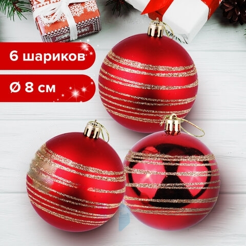 Шары елочные с узором ЗОЛОТАЯ СКАЗКА, НАБОР 6 штук, пластик, 8 см, красные, 3 глянцевых, 3 матовых, 590883