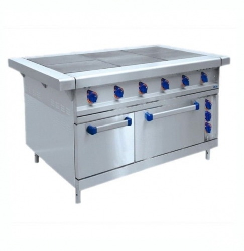 Плоские чугунные конфорки и жарочный шкаф разогреваются до максимальной температуры за 30 минут. Плита оснащена переключателями с плавной регулировкой мощности. Духовка имеет направляющие для противней размером 530х470х30 мм, а также раздельную регулировку мощности верхних и нижних ТЭНов. Встроенный терморегулятор предохраняет духовку от перегрева.