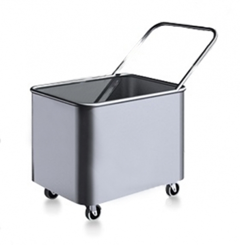 Тележка грузоподъемностью 60 кг позволяет перевозить белье в прачечной. Короб объемом 100 л установлен на 4 поворотных колеса d 75 мм и дополнен ручкой. Все углы конструкции сглажены.