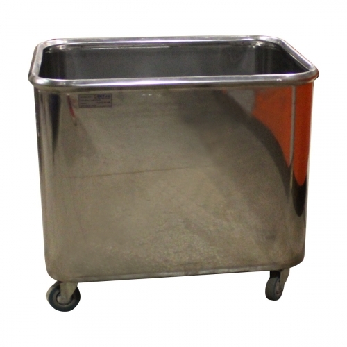 У тележки объемом 100 л усиленная перекладинами рама и 4 поворотных колеса (d 75 мм). Короб вмещает посуду или другие предметы для транспортировки в пищеблоке. Грузоподъемность 60 кг. Ручки нет. Бортики и углы труб закруглены.