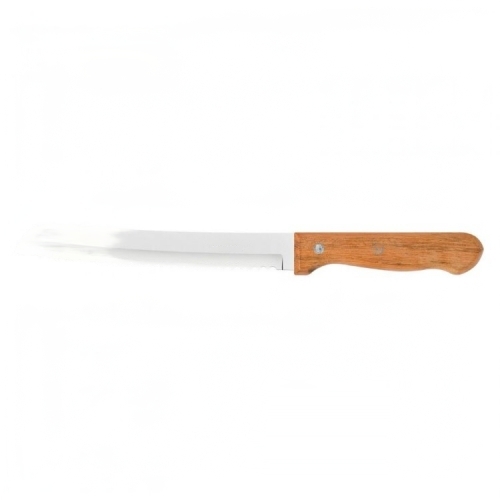 Нож для хлеба с деревянной ручкой, лезвие зубчатое из прочной нержавеющей стали. Применяется для нарезания хлеба. Рекомендуется для использования в столовых школ и детских садов.