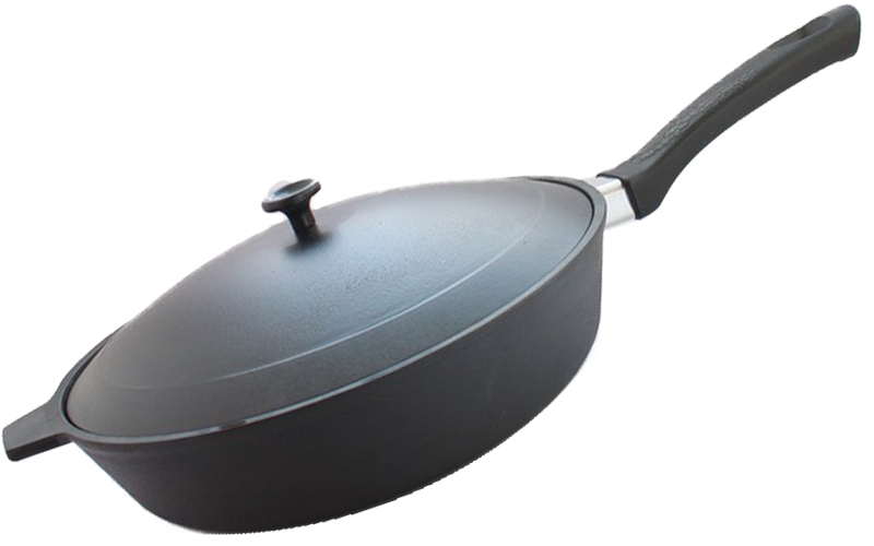 Чугунная сковорода с бакелитовой ручкой и алюминиевой крышкой может применяться на кухне в ДОУ и школе. Длительное время сохраняет тепло, толстое дно равномерно распределяет температуру. Удобная эргономичная ручка, не съемная. Без антипригарного покрытия.