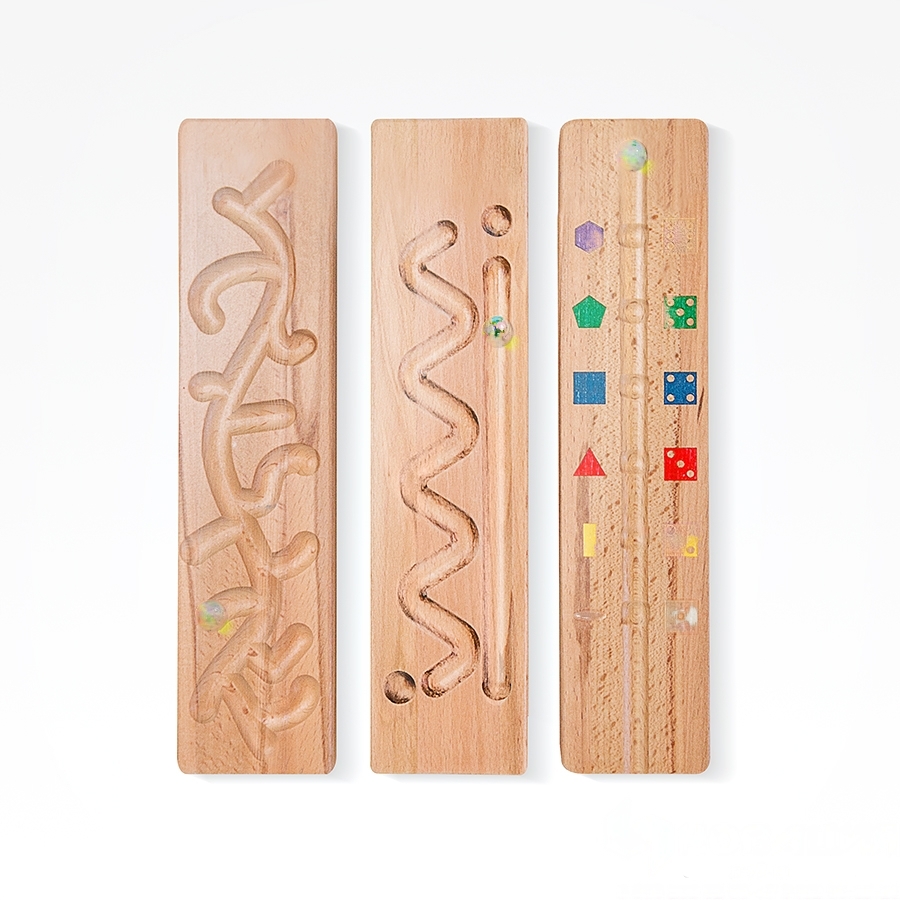 2 шарика из стекла, деревянная основа (285х70х20 мм) с волнистой дорожкой, прямым желобом и 2-мя отверстиями.