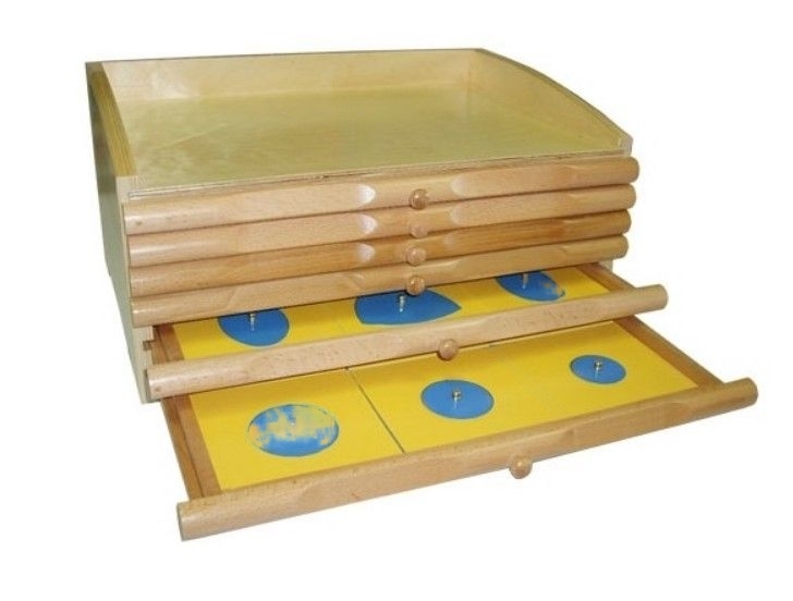 6-ярусный комод оснащен ручками для выдвигания. Ребенок самостоятельно изучает рамку на каждом ярусе. Необходимо заполнить отверстие подходящей геометрической фигурой.