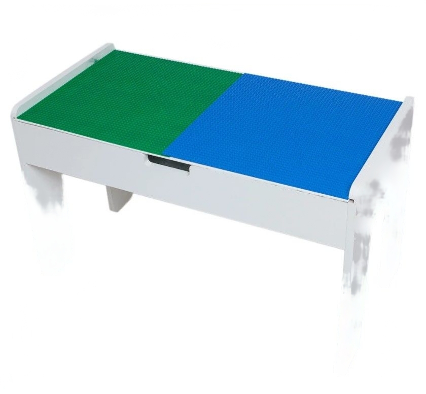 Детали хранятся внутри мебели, верхнее полотно служит рабочим полем. На крышке можно собирать конструктор, лепить, обучаться письму и чтению. Это легкая конструкция для крупных и мелких элементов. В столе помещается до 12-ти конструкторов.