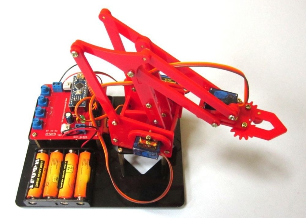 4 сервомотора, крепежные элементы, 2 батарейных отсека и блок управления с контроллером Arduino поставляются в комплекте.
