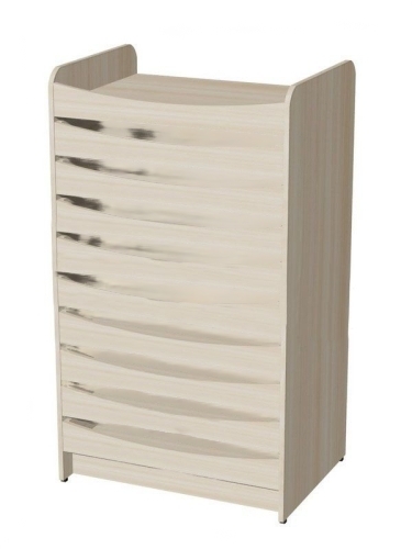 Прямой фасад с цоколем оснащается 9 выдвижными отделениями с бортиками. Содержимое каждого ящика частично открыто для читателя. Поверхность топа используется для выставки экземпляров и работы с газетами.