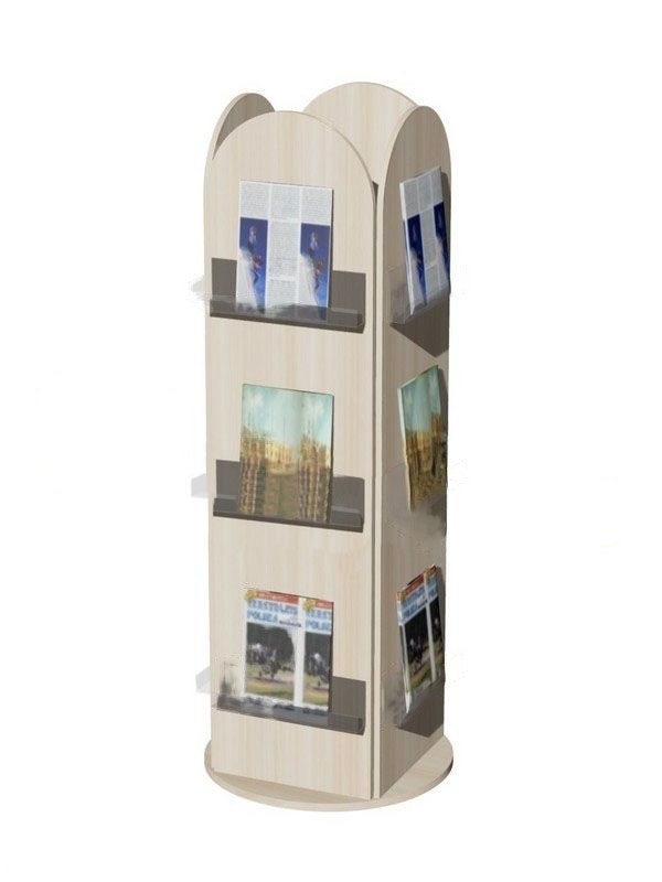 Стеллаж изготовлен из ЛДСП, верхние края боковых панелей закругляются. Каждая из сторон оснащена 3-мя прозрачными отделениями с бортиками. Корпус вращается над круглой стационарной опорой.
