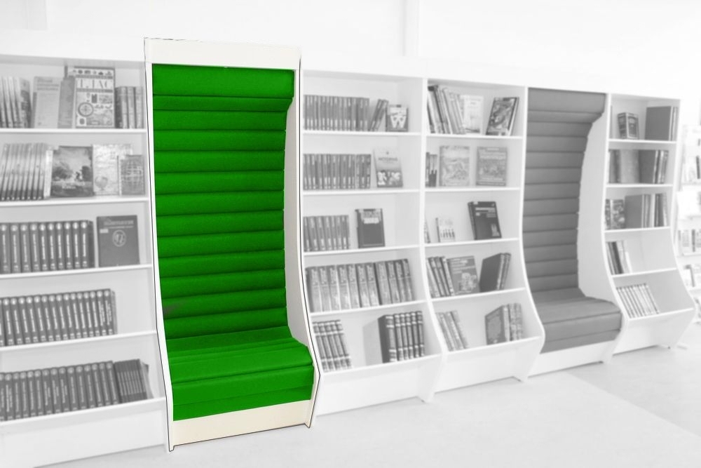Посадочное место дополняет стеллаж для книг в современном информационно-библиотечном центре. Сиденье плавно переходит в спинку с наклонной верхней частью. Несколько стеллажей и посадочных мест формируют единый комплекс.