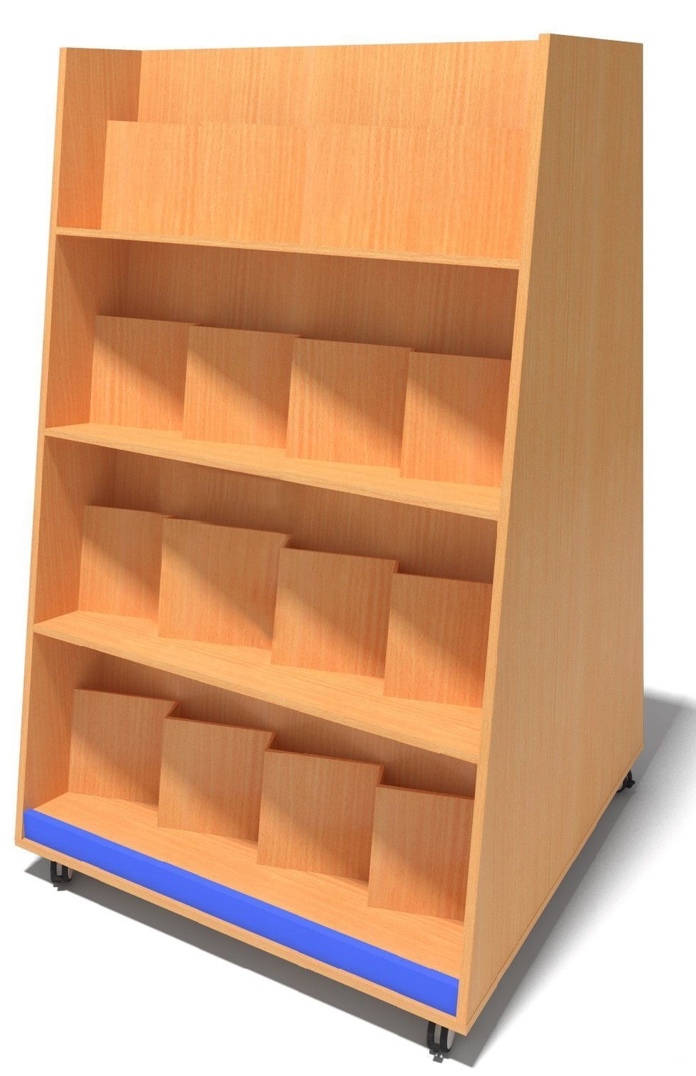 Двухсторонняя демонстрационная витрина для современных библиотек и школ оснащена 4 полками с вертикальными отделениями с двух сторон и колесными опорами. Книги и журналы, методические материалы расставляются под углом, благодаря чему посетитель издалека видит обложку.