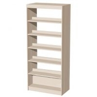 На каждой стороне по 6 или 7 полок, нижняя оснащена глухой стенкой, другие отделения сквозные. Книги разделяются бортиками.