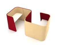 Двойное рабочее пространство подходит для создания коворкингов, мягких зон и гардеробных. Конструкция s-образной формы занимает 4,5 кв.м. Вертикальные панели образуют 2 ограниченных участка с общей стенкой и отдельными входами. На каждом участке закрепляется прямоугольная столешница из ЛДСП (25 мм). Перегородки поглощают шум. Обивка выдерживает не менее 20000 циклов истирания.
