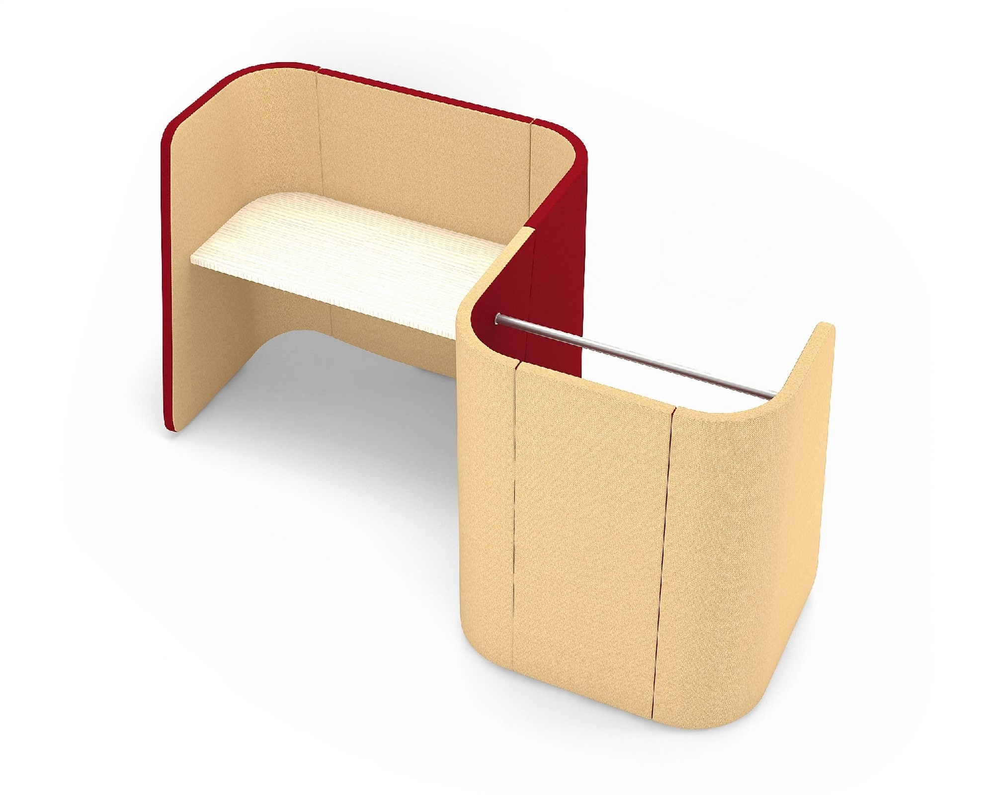 Рабочее пространство используется при зонировании коворкингов, вестибюлей, гардеробных. S-образная конструкция из вертикальных панелей занимает 3,429 кв.м. Изогнутые контуры позволяют разделить площадь на 2 участка, ограниченных боковыми перегородками. Каждый оборудуется прямоугольной столешницей из ЛДСП (25 мм). Панели поглощают шум. Обивка выдерживает не менее 20000 циклов истирания.