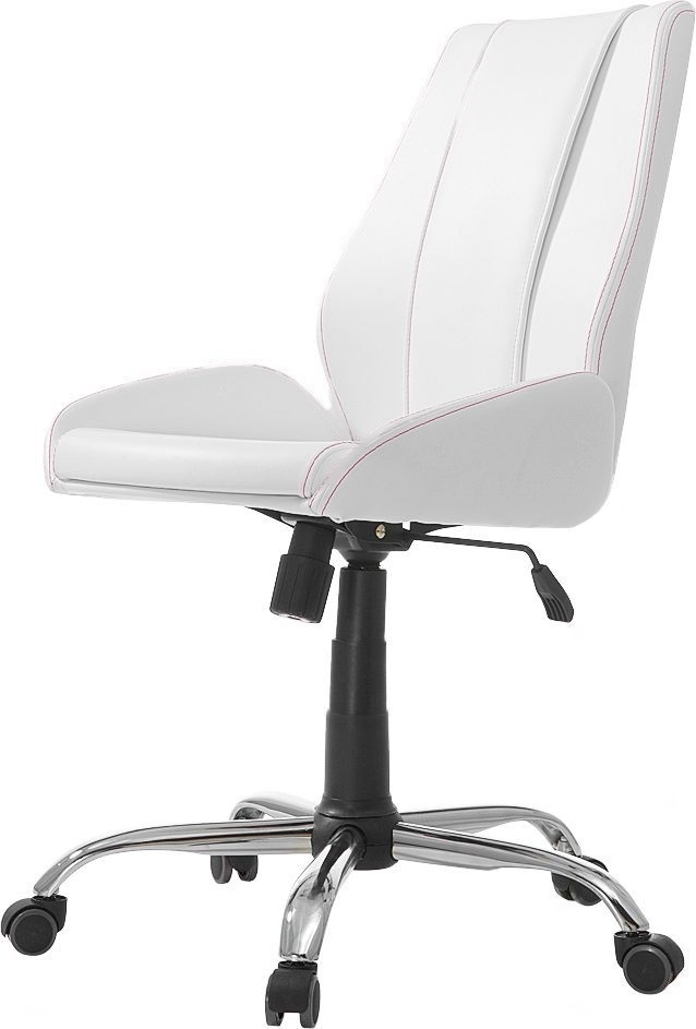 Кресло с мягким посадочным местом дополнено невысокими подлокотниками. Обивка из экокожи прошита, устойчива к истиранию. Спинка делится на 3 вертикальные части для распределения нагрузки. Высота сиденья меняется при помощи рычага. Наклон спинки регулируется винтом. Пятилучье хромированное, с роликами из пластика.