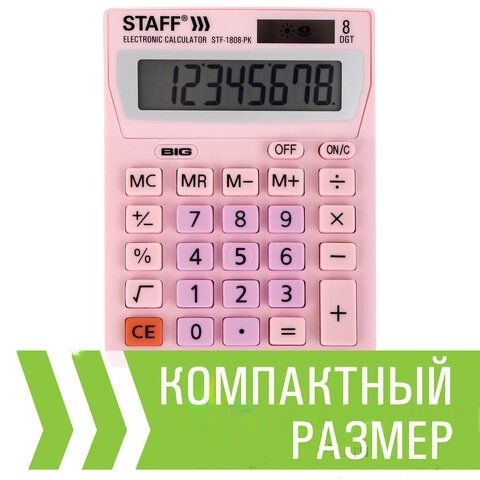 Калькулятор настольный STAFF STF-1808-PK, КОМПАКТНЫЙ (140х105 мм), 8 разрядов, двойное питание, РОЗОВЫЙ, 250468