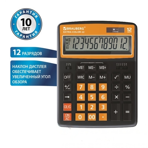 Калькулятор настольный BRAUBERG EXTRA COLOR-12-BKRG (206x155 мм), 12 разрядов, двойное питание, ЧЕРНО-ОРАНЖЕВЫЙ, 250478