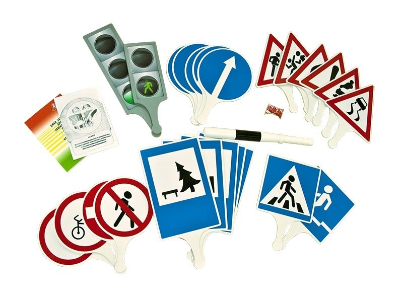 Обучающий комплекс содержит наборы игровых дорожных знаков (предупреждающих, запрещающих, предписывающих, знаков сервиса), а также макеты дорожных светофоров и других технических средств.