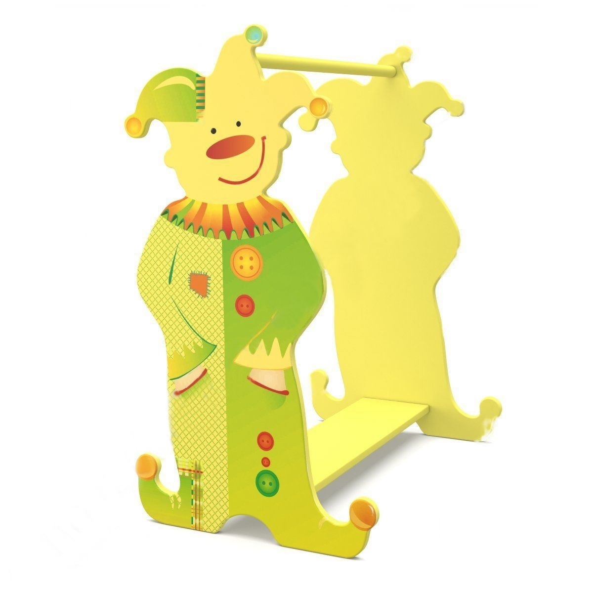 Вешалка для сценических костюмов состоит из перекладины, боковых фигурных панелей, нижней полки. Снаружи стенки украшены цветным изображением клоуна. На полку можно поставить обувь.