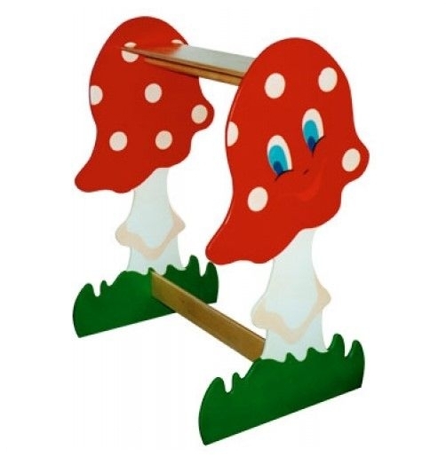 Уголок ряжения размещается в гримерной детского театра. 2 фигурные панели в форме мухоморов соединяются нижней перекладиной. Наверху закреплена штанга для вешалок с костюмами.