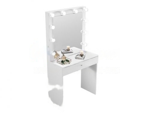 Столик оснащен зеркалом с подсветкой. Набор диодных лампочек входит в комплект. Для хранения грима, кистей предназначен выдвижной ящик.
